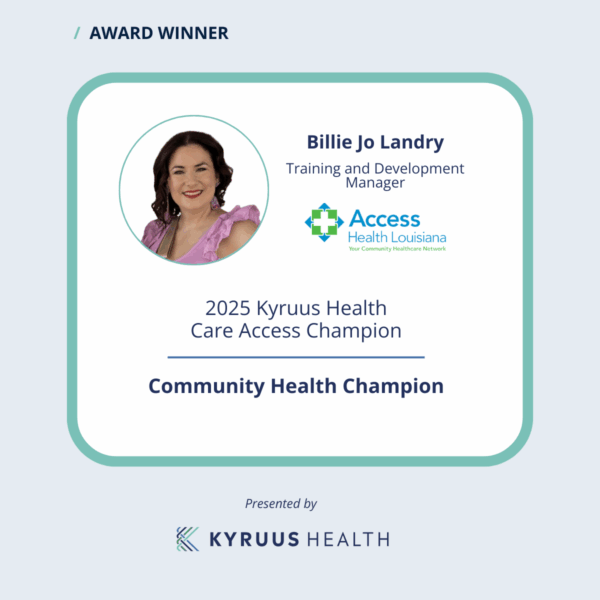 that Billie Jo Landy with Access Health Louisiana has won the Community Health Champion in the inaugural 2025 Kyruus Health Care Access Champion Awards!