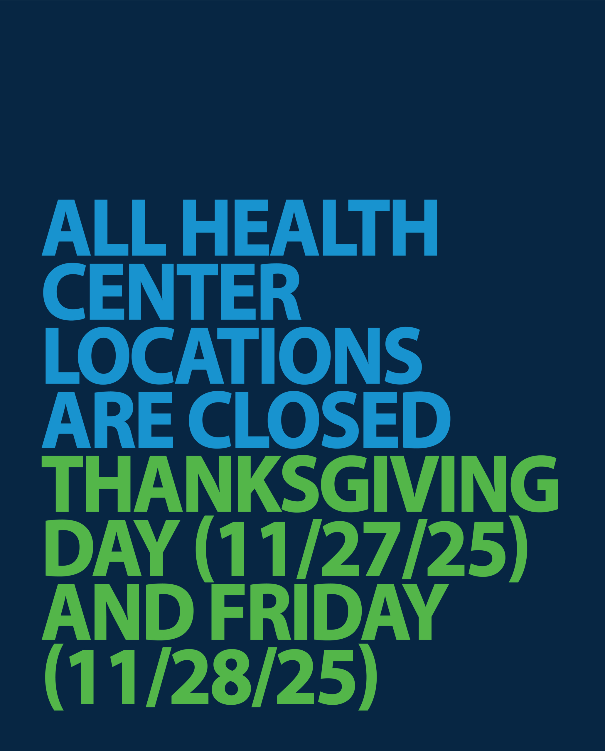 Our Health Centers and Pharmacies will be closed on Thursday and Friday November 27 and 28 in observance of the holiday.