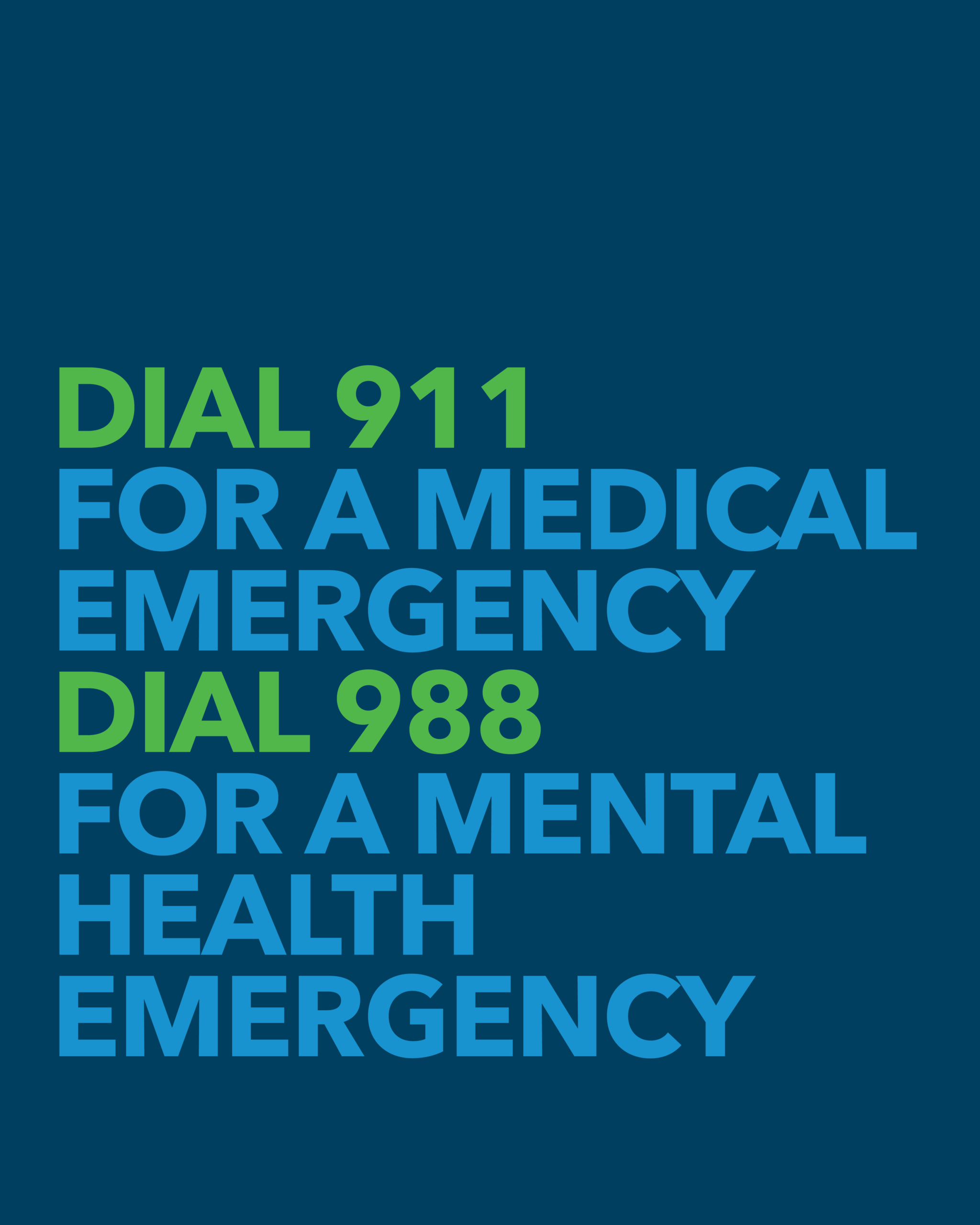 Please dial 911 for a health emergency or dial 988 for a mental health emergency